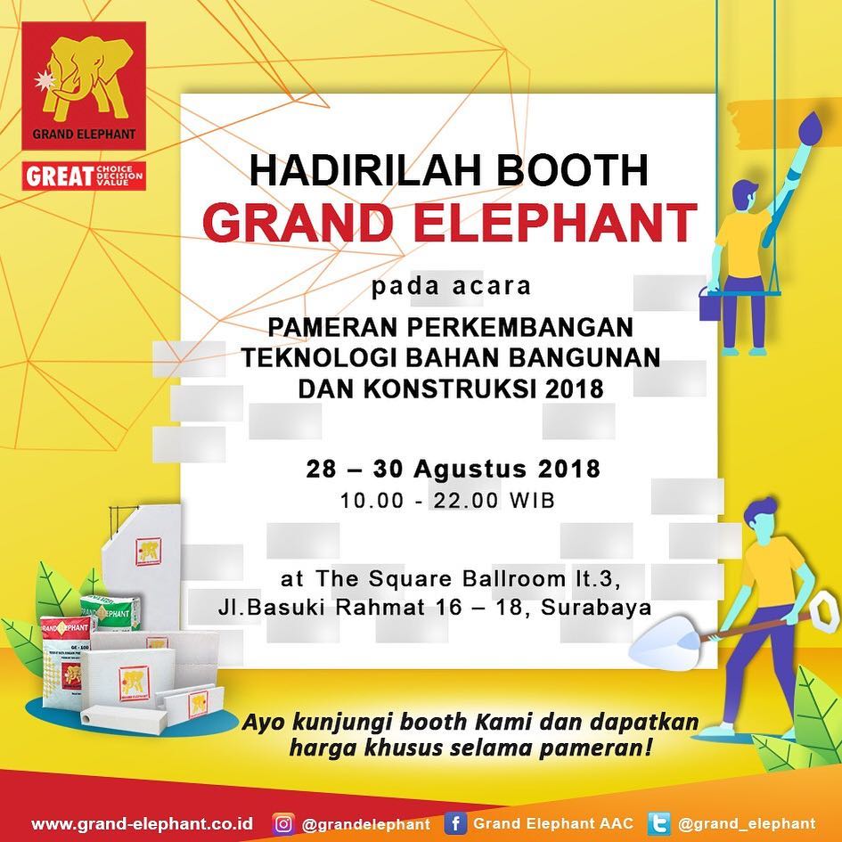 Selamat siang Kawan! Grand Elephant akan hadir di acara Pameran Perkembangan Teknologi Bahan Bangunan dan Konstruksi 2018 di The Square Ballroom lantai 3. Akan ada banyak kegiatan seru, hiburan, dan berbagai hadiah menarik yang bisa kamu dapatkan di booth Grand Elephant. Yuk tandai kalendermu untuk datang ke booth Grand Elephant, jangan sampai lupa ya! .